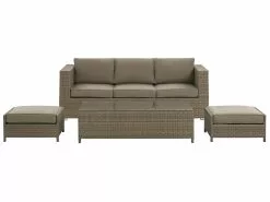 Anna ulkotilallesi uusi ilme tällä klassisella ulkosohvaryhmällä. Yksinkertaisen mutta ajattoman muotoilunsa ansiosta kalusteryhmä sopii täydellisesti moderneihin, perinteisiin tai nykyaikaisiin sisustuksiin. Vankasta alumiinista ja kestävästä polyrottingista valmistetuissa kalusteissa on paksut ruskeat pehmusteet, jotka tarjoavat mukavuuden. Käytännöllisen sohvapöydän leveä taso on viimeistelty karkaistulla lasilla. Mukana tulevat rahit on helppo asettaa sohvapöydän alle, kun ne eivät ole käytössä.