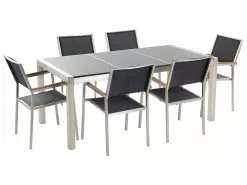 Poikkeuksellinen puutarhakalustesetti, joka luo ainutlaatuisen ilmeen mihin tahansa puutarhaan. Kalusteiden rungot on valmistettu vankasta ja kestävästä ruostumattomasta teräksestä, joka takaa, että setti pysyy upeana pitkään. Hopea runko korostaa harmaata kiillotettua graniittitasoa kauniisti. Pinottavien tuolien selkänojat ja istuinosat ovat UV-kestävää mustaa polyesteriä, joka täydentää pöytää täydellisesti. Säänkestävien materiaalien yhdistelmä antaa ulkoruokailuryhmälle modernin ilmeen. Setti tarjoaa tilaa jopa 6 hengelle, jonka ansiosta se on täydellinen lisä kesän puutarhajuhliin.
