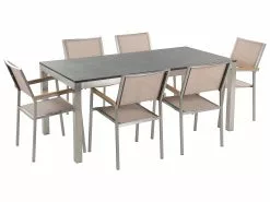 Poikkeuksellinen puutarhakalustesetti, joka luo ainutlaatuisen ilmeen mihin tahansa puutarhaan. Kalusteiden rungot on valmistettu vankasta ja kestävästä ruostumattomasta teräksestä, joka takaa, että setti pysyy upeana pitkään. Hopea runko korostaa mustaa poltettua graniittitasoa kauniisti. Pinottavien tuolien selkänojat ja istuinosat ovat UV-kestävää beigeä polyesteriä, joka täydentää pöytää täydellisesti. Säänkestävien materiaalien yhdistelmä antaa ulkoruokailuryhmälle modernin ilmeen. Setti tarjoaa tilaa jopa 6 hengelle, jonka ansiosta se on täydellinen lisä kesän puutarhajuhliin.