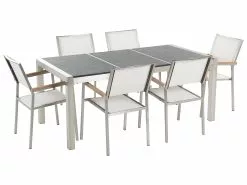 Poikkeuksellinen puutarhakalustesetti, joka luo ainutlaatuisen ilmeen mihin tahansa puutarhaan. Kalusteiden rungot on valmistettu vankasta ja kestävästä ruostumattomasta teräksestä, joka takaa, että setti pysyy upeana pitkään. Hopea runko korostaa mustaa poltettua graniittitasoa kauniisti. Pinottavien tuolien selkänojat ja istuinosat ovat UV-kestävää valkoista polyesteriä, joka täydentää pöytää täydellisesti. Säänkestävien materiaalien yhdistelmä antaa ulkoruokailuryhmälle modernin ilmeen. Setti tarjoaa tilaa jopa 6 hengelle, jonka ansiosta se on täydellinen lisä kesän puutarhajuhliin.