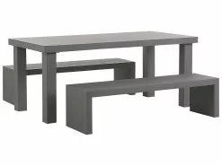 Tämä moderni ulkoruokailuryhmä tarjoaa loistavasti tilaa jopa 4 hengelle. Kalusteryhmän yksinkertainen muotoilu ja selkeät linjat lisäävät ulkotilaan teollista tunnelmaa. Kevyestä kuitusementistä valmistettu puutarhakalustesetti on vahvistettu teräsrungolla vakauden takaamiseksi. Tämän ansiosta se on kevyempi kuin kiinteä sementti, mikä helpottaa kalusteiden siirtoa. Huolella valittu materiaali on likaa hylkivä ja erittäin helppohoitoinen. Minimalistiset muodot korostavat klassisen harmaata väriä täydellisesti.